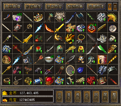 图鉴系统:分为三个类别,分别为装备图鉴,配饰图腾,异兽图腾(打开背包第一排了解详情),当玩家佩戴了装备后,多余的装备可以进行收集,集齐后增加大量永久属性。
